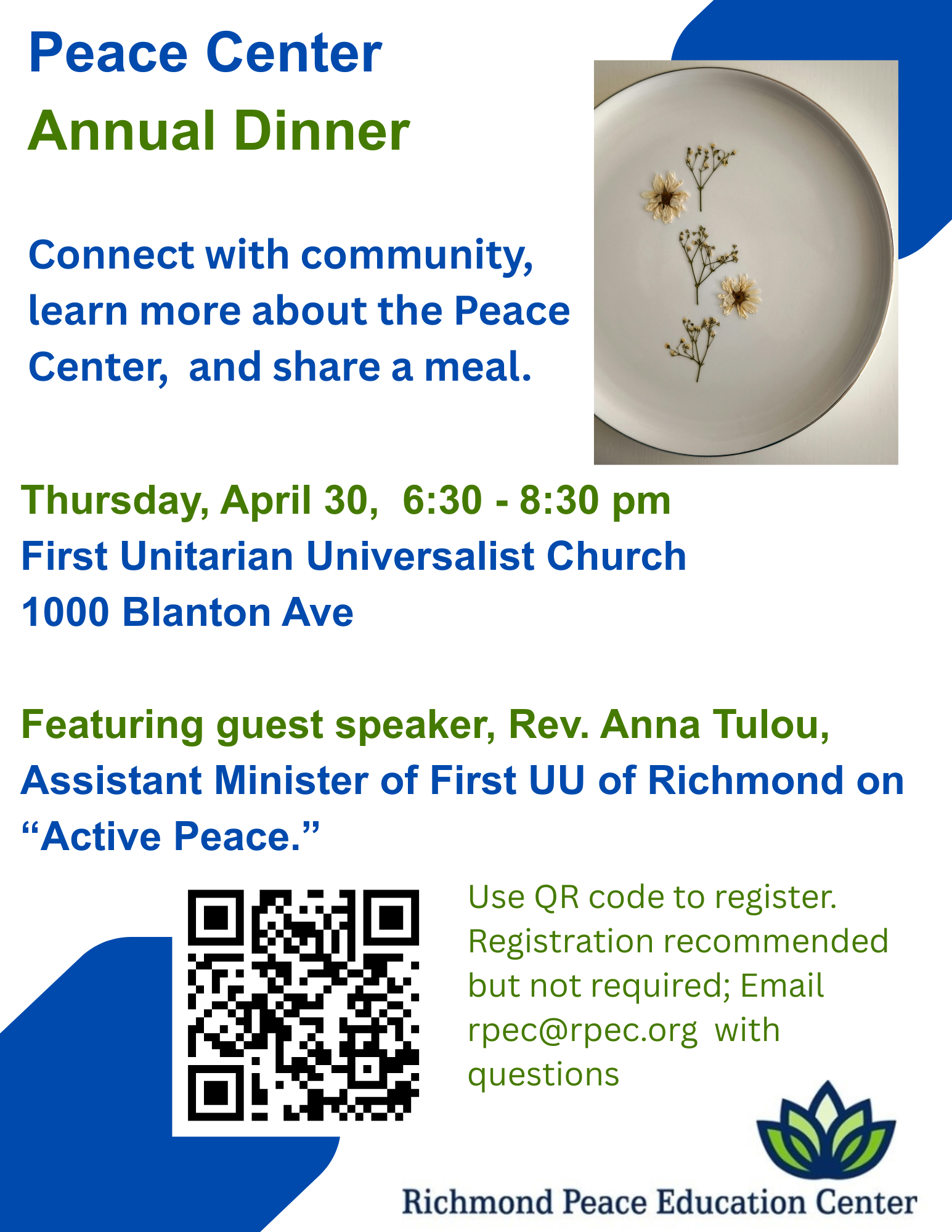 Richmond Peace Education Center's Annual Dinner Thursday, April 30, 2026 6:30 PM 8:30 PM 18:30 20:30 First Unitarian Universalist Church 1000 Blanton Avenue Richmond, VA, 23221 United States (map) Google Calendar ICS Join the Peace Center for our annual celebration dinner